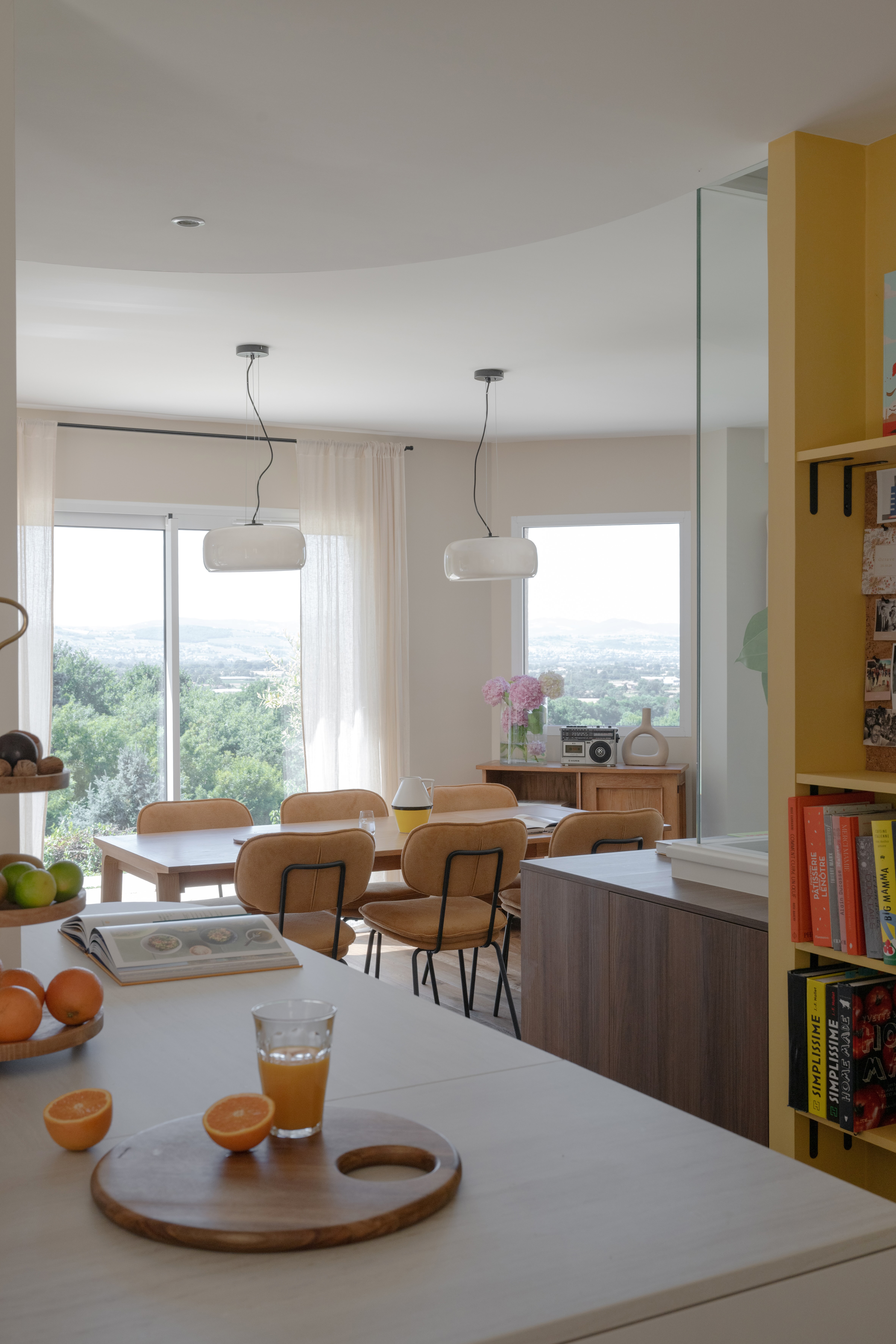 Pour ce projet situé à Saint-Germain-au-Mont-d’Or, les clients m’ont sollicitée afin de moderniser et d’optimiser les pièces de vie au rez-de-chaussée de leur future maison. L’objectif était de donner un nouveau souffle à un intérieur des années 2000, tant sur le plan esthétique que fonctionnel, tout en valorisant les volumes et la belle vue dégagée sur l’extérieur.