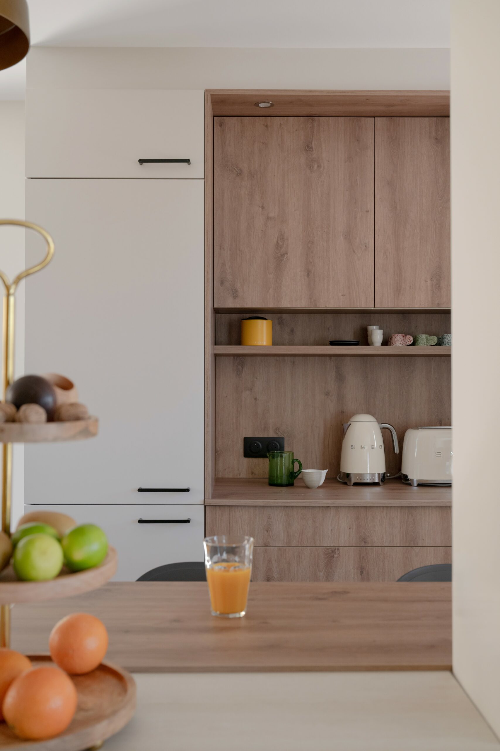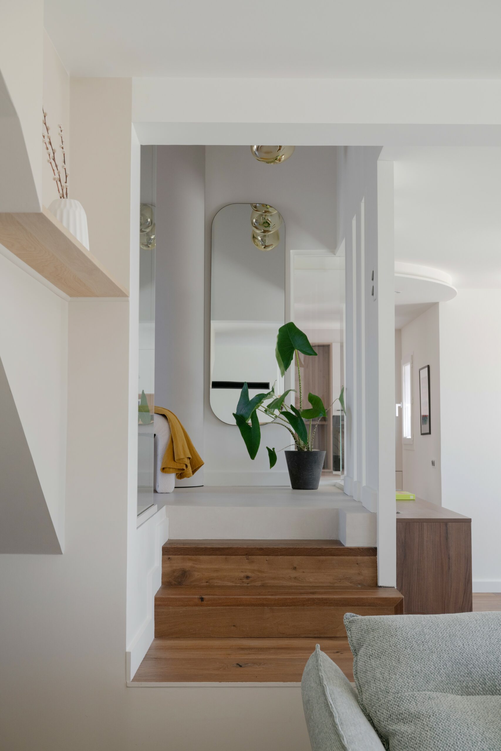 Le cœur du projet a donc été de travailler en fonction de ces contraintes, en particulier la gestion des marches entre l’entrée et la pièce principale. J’ai proposé une révision de cette transition pour fluidifier les circulations, structurer davantage l’espace et créer une entrée fonctionnelle, intégrant des rangements sur-mesure.